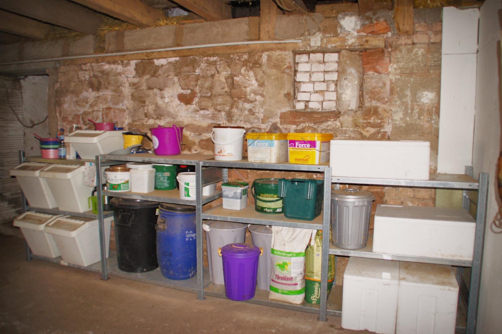 Unsere Sattel- & Futterkammer bietet Verstauungsmöglichkeiten für Zubehör wie z.B. Futtertonnen, Eimer und sonstiges Equipment.